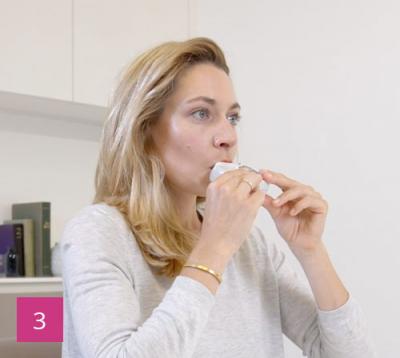 Halten Sie Ihren Inhalator von Ihrem Mund weg. Atmen Sie vollständig aus. Achten Sie dabei darauf, nicht in den Inhalator hinein zu atmen.