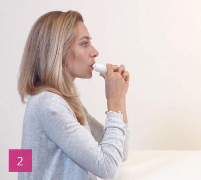 Nehmen Sie das Mundstück zwischen Ihre Lippen und umschließen Sie es eng mit Ihren Lippen. Achten Sie darauf, während des Inhalierens, nicht die Taste gedrückt zu halten. Nehmen Sie nun einen kräftigen tiefen Atemzug durch den Mund. Ein Klick-Geräusch zeigt Ihnen, dass das Medikament abgegeben wurde.